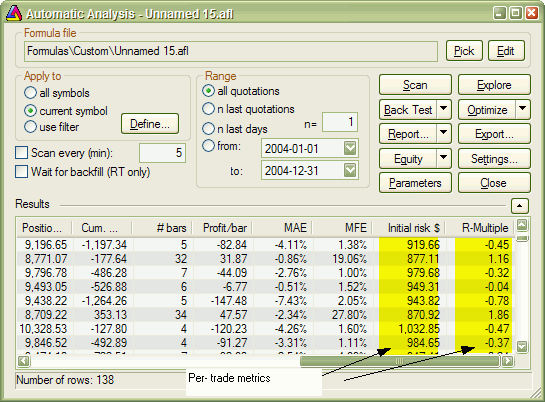 The code is basically very similar to example 2. There are only few differences. First is that we call Backtest method with NoTradeList parameter set to 1. This way we disable default trade listing, so we can add custom per-trade metrics and list trades later by calling ListTrades method. Later we iterate through trades and calculate risk based on trade entry value and amount of max. loss stop used. The RMultiple is then calculated as trade profit divided by the amount risked per trade. Both risk and r-multiple are then added as custom per-trade metrics (note that we are callind AddCustomMetric method of Trade object here). Later on we do remaining calculations. At the end of the custom backtest procedure we are adding custom backtest metric (this time calling AddCustomMetric method of Backtester object), and after that we trigger listing of the trades using ListTrades method. For simplicity we ignore any open positions that may have left at the end of analysis period. The only change to the trading system itself was addition of maximum loss stop (ApplyStop line).