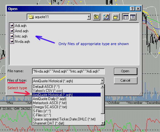 In this picture I marked the most important items for easy identification. Marked with red is type selector combo-box ("Files of type"). In order to import AmiQuote files (those with .AQH and .AQD extensions you should choose AmiQuote Historical or AmiQuote Daily, or AmiQuote Intraday (.AQI) or AmiQuote MSN (.AQM) or AmiQuote eSignalCentral (.AQE) from the combo box (red arrow shows those options).