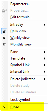 To remove the indicator, press Close button from the menu on the top right-hand side of the indicator pane (the menu will be displayed if you place the mouse cursor in the nearby). This menu allows you also to move the indicator pane up/down or maximize the pane.