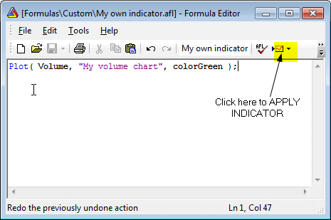 Second method involves writing an indicator formula in flexible AFL (AmiBroker Formula Language). You can find the description of this language in AFL Reference Guide section of user's guide. Here we will present basic steps needed to define and display your own custom indicator. In this example we will define an "indicator" that will show line volume graph (opposite to built-in bar volume graph).