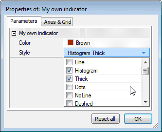 Then press Apply indicator to apply the changes. Now click with RIGHT mouse button over chart pane again and select Parameters (or press Ctrl+R) and you will see parameters dialog allowing to modify colors and styles used to plot a chart: