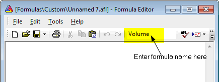 This formula instructs AmiBroker to plot built-in Volume array. Second parameter specifies the title of the plot and third parameter defines the color. The picture below shows formula editor after entering the code: