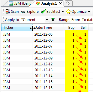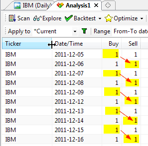 The following pictures show which signals are taken and resulting trade list. As we can see, this time all signals are acted upon and we have sequence of single-bar trades.