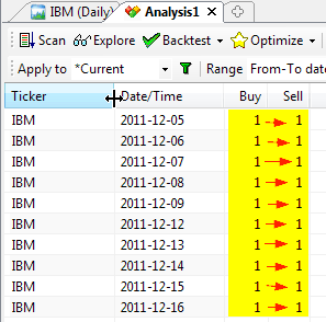 The following pictures show which signals are taken and resulting trade list. All trades begin one day and end next day. New trade is open on the following day.