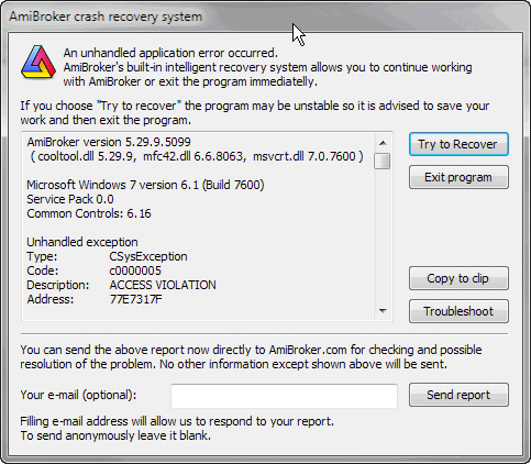 As you can see there is a window that displays important system information and there are five buttons Try to recover, Exit program, Copy to clip, Troubleshoot, Send report. Clicking on the Exit program button works exactly the same as clicking on "OK" button in the standard Windows dead-end message box. But the first two buttons give you brand new possibilities. If you click on Try to recover button AmiBroker will try to recover from the error and continue running. In most cases you will be able to save your work and modifications you have made so you will not lose anything. In fact you will be able to work normally. There are however some cases when recovery will not succeed and AmiBroker may be unstable, so it is advised just to save your data and exit. It may also happen that this window will pop up for a couple of times - then you should just click on Try to recover several times. Copy to clip - copies bug report details with system information to clipboard so you can paste this information in e-mail program and send it to us.