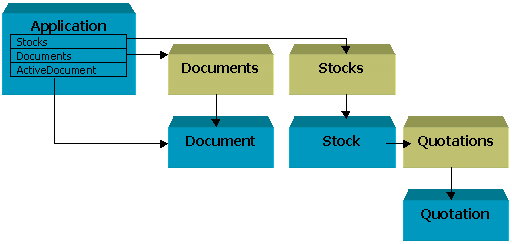 As you can see all objects are accessible from the parent Application object. So all your scripts must first create AmiBroker Application object and then access the objects located deeper in the hierarchy. In the picture above you can see that some of the objects have yellow color - these object represent collections. A collection is an object that contains zero or more objects of the same class. So Stocks collection contains zero or more objects of the Stock class. Collections are used mainly to interate thru objects and manage adding/removing of the objects belonging to a collection. As you can guess you will work the most often with a Stocks and Quotations collection and a Stock and Quotation objects. These (and other) objects expose properties that are data members of the object. The value of the property can be retrieved or set (if the property is not read-only). For example Quotation object has Date, Open, Close, High, Low, Volume, OpenInt properties that holds this quotation data. A complete list of properties of AmiBroker objects' properties can be found in Automation Object Model Reference section of AmiBroker's User guide. Object could have also methods. A method is aprocedure that is exposed by an object and performs a specific action (for example Application object has a method called RefreshAll() which refreshes all views and lists of AmiBroker).
