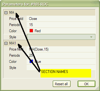 _SECTION_BEGIN/_SECTION_END markers allow AmiBroker to identify code parts and modify them later (for example remove individual sections). In addition to that sections provide the way to make sure that parameters having the same name in many code parts do not interfere each other. For example if you drop two moving averages the resulting code will look as follows: